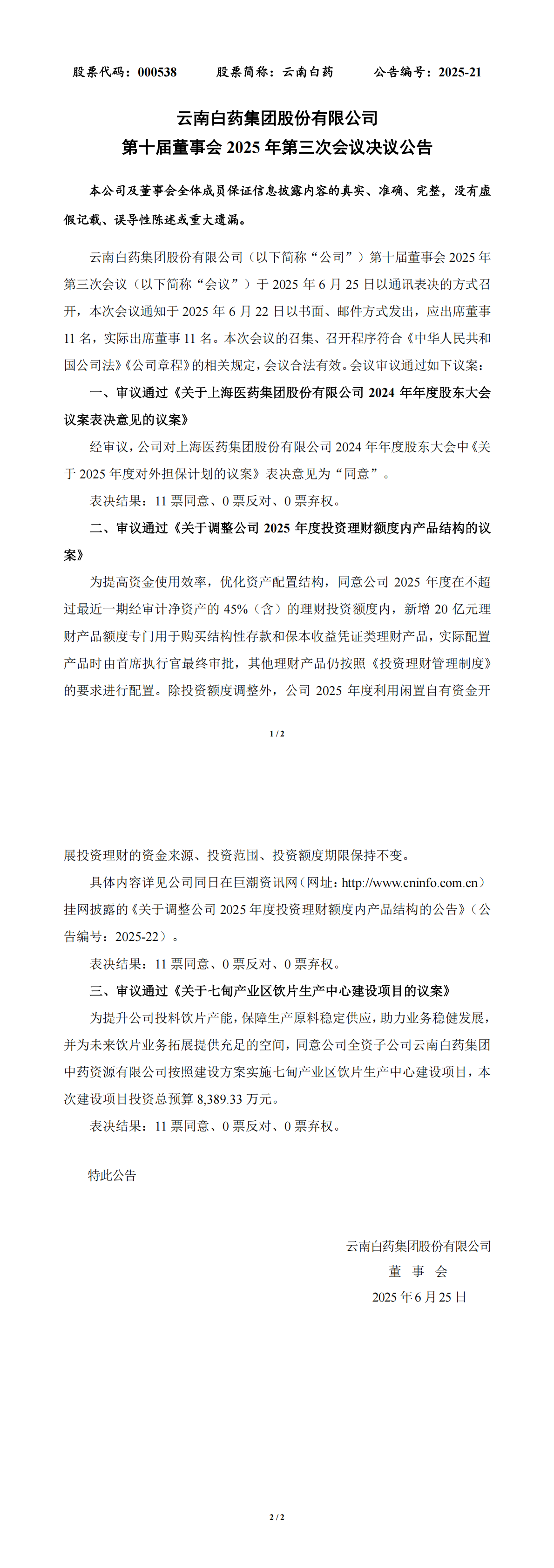 云南白藥集團股份有限公司 第十屆董事會 2025 年第三次會議決議公告