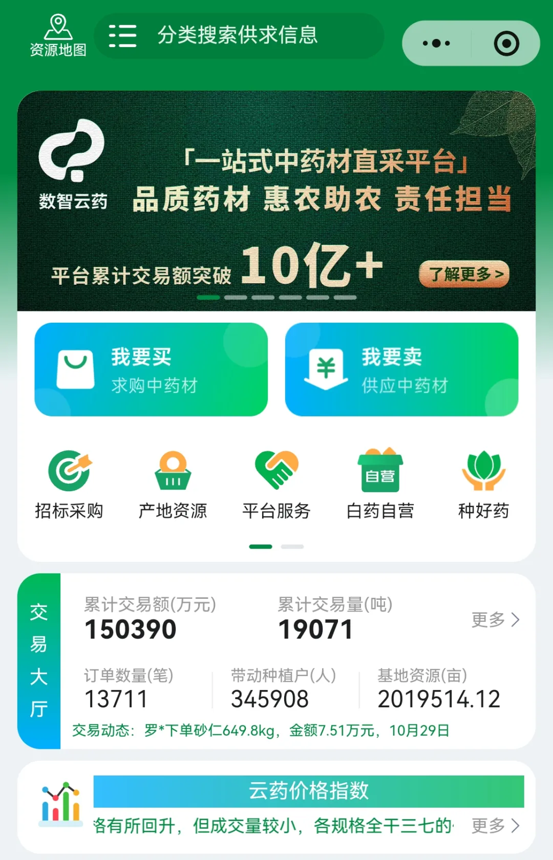 一手建基地,一手上云端。打開云南白藥開發的“數智云藥”小程序,各類交易信息實時更新、一目了然,點擊“我要買”或“我要賣”,便能實現產品的云選、撮合、交易,僅屏邊苗族自治縣的注冊用戶便已超過7000人。